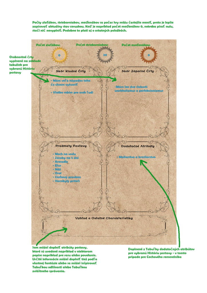 Odpoveď: Bod 15. z tvorby postavy z úvodu pravidiel, hovorí práve o tom, že z textu napríklad povolania, si môže hráč doplniť Dodatočné atribúty svojej postavy. Čiže v prípade napríklad obchodníka si môže poznačiť, že sa napríklad venuje drevorubačstvu, respektíve obchodovaniu s drevom atď.